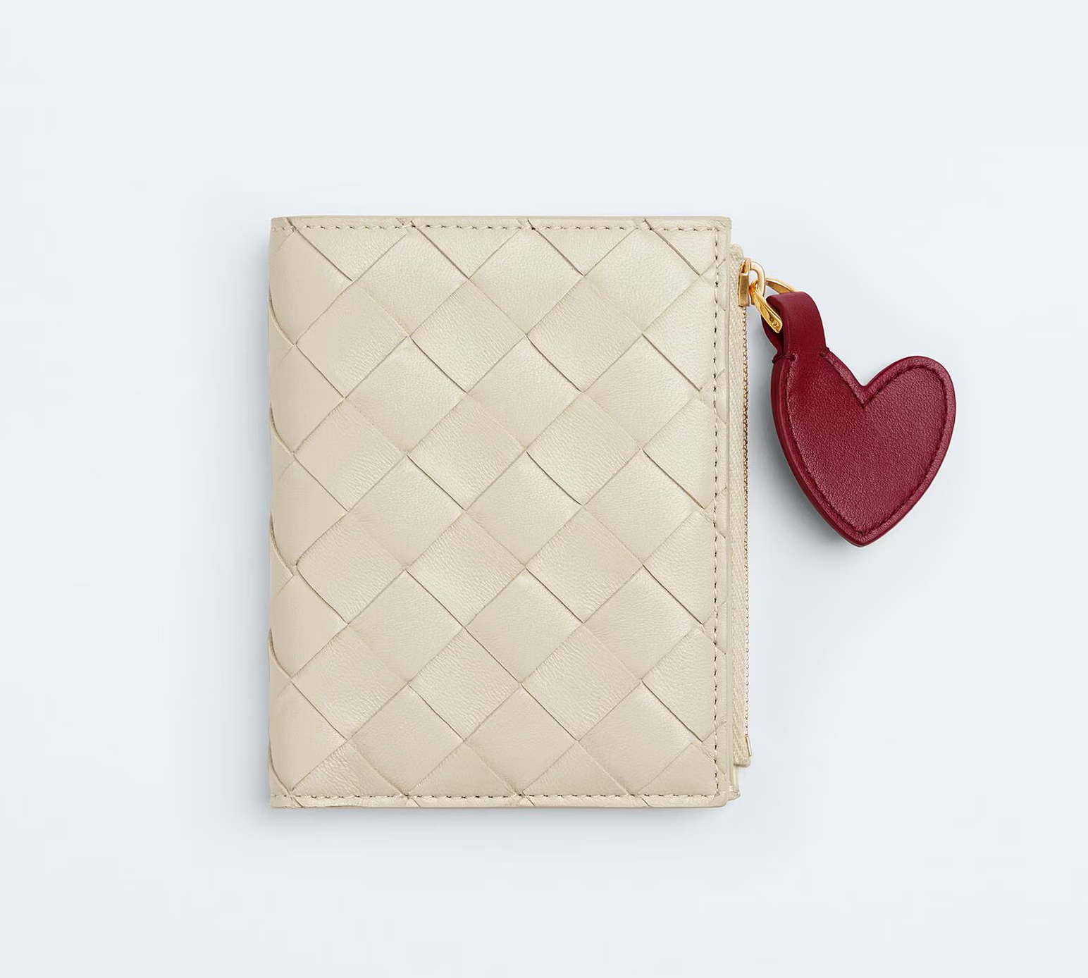 No obstante, la cápsula no se limita a las siluetas principales. El corazón de Bottega Veneta se desplaza hacia objetos más pequeños: fundas de pasaporte, charms, carteras y tarjeteros. Piezas que no buscan protagonismo, pero que refuerzan la idea central de la colección: el romance también puede habitar lo cotidiano.
